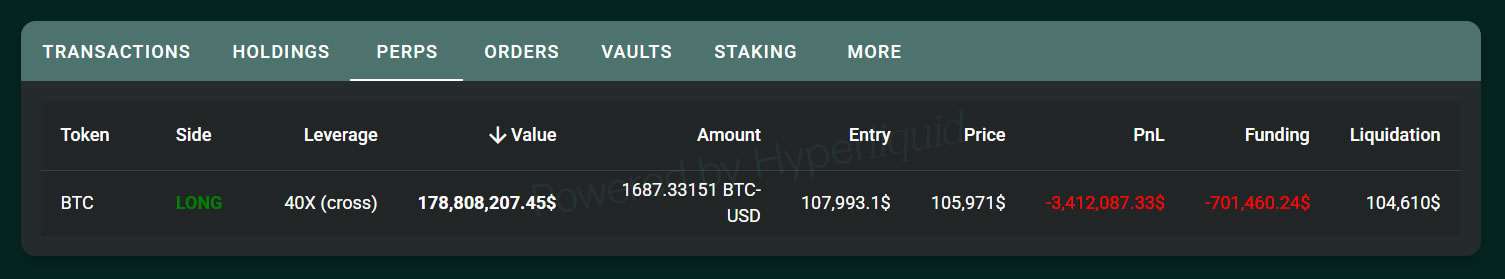 Theo dữ liệu từ Hypurrscan, Wynn vẫn giữ nguyên vị thế long với đòn bẩy 40 lần thông qua hợp đồng perpetual. Vị thế này được mở khi giá Bitcoin ở mức 107,993 USD và hiện đang chịu khoản lỗ chưa thực hiện khoảng 3,4 triệu USD.