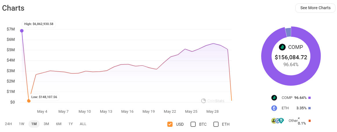 Theo Coinstats, sau vụ chuyển nhượng Pepe trị giá hơn 9,5 triệu USD sang Binance, ví của cá voi, “0x546”, hiện chỉ có tiền điện tử trị giá 161.449 USD, với hơn 96% cổ phần bao gồm token Compound (COMP), theo Coinstats.
