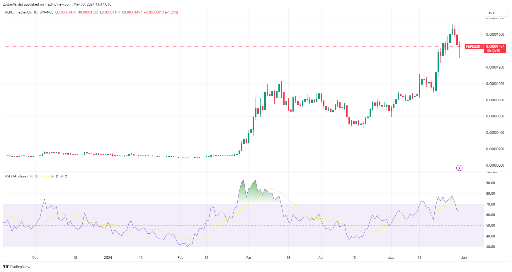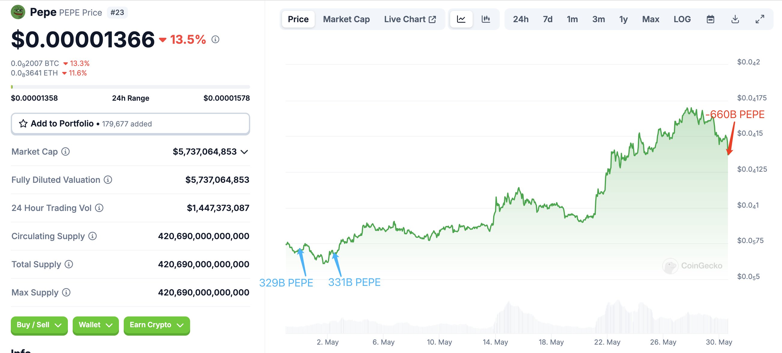 Theo TradingView, giá của Pepe đã giảm hơn 4,4% trong 24 giờ tính đến 1:45 chiều UTC và giao dịch ở mức 0,00001437 USD. Token giảm hơn 17% so với mức cao nhất mọi thời đại.