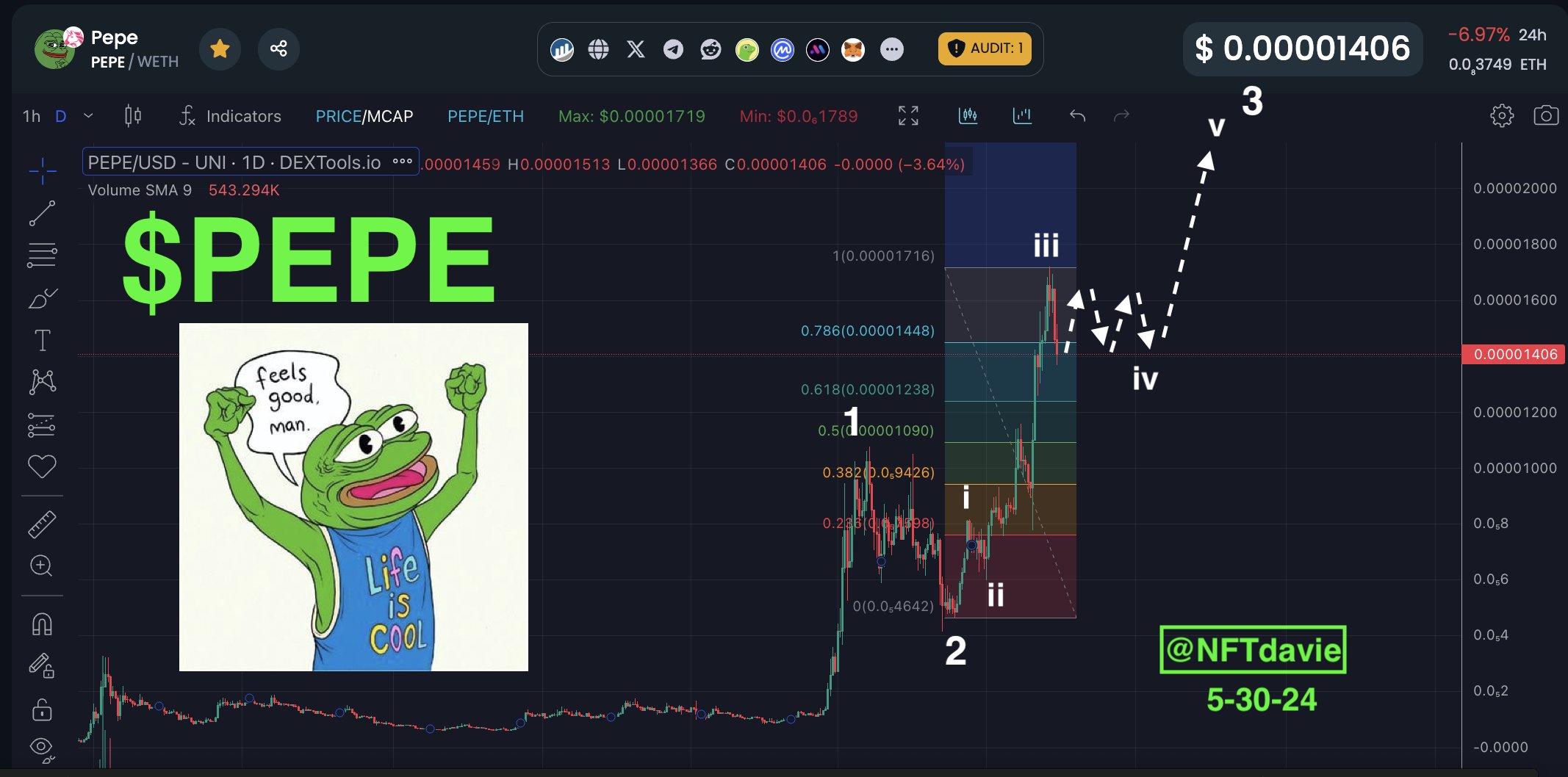 Tuy nhiên, sự điều chỉnh hiện tại của Pepe cũng có thể cho thấy sự hình thành của một chu kỳ cường điệu mới, có thể giúp vốn hóa thị trường của Pepe đạt hơn 10 tỷ USD, theo nhà phân tích tiền điện tử có biệt danh Davie Satoshi, người đã viết trong bài đăng trên X vào ngày 30 tháng 5: