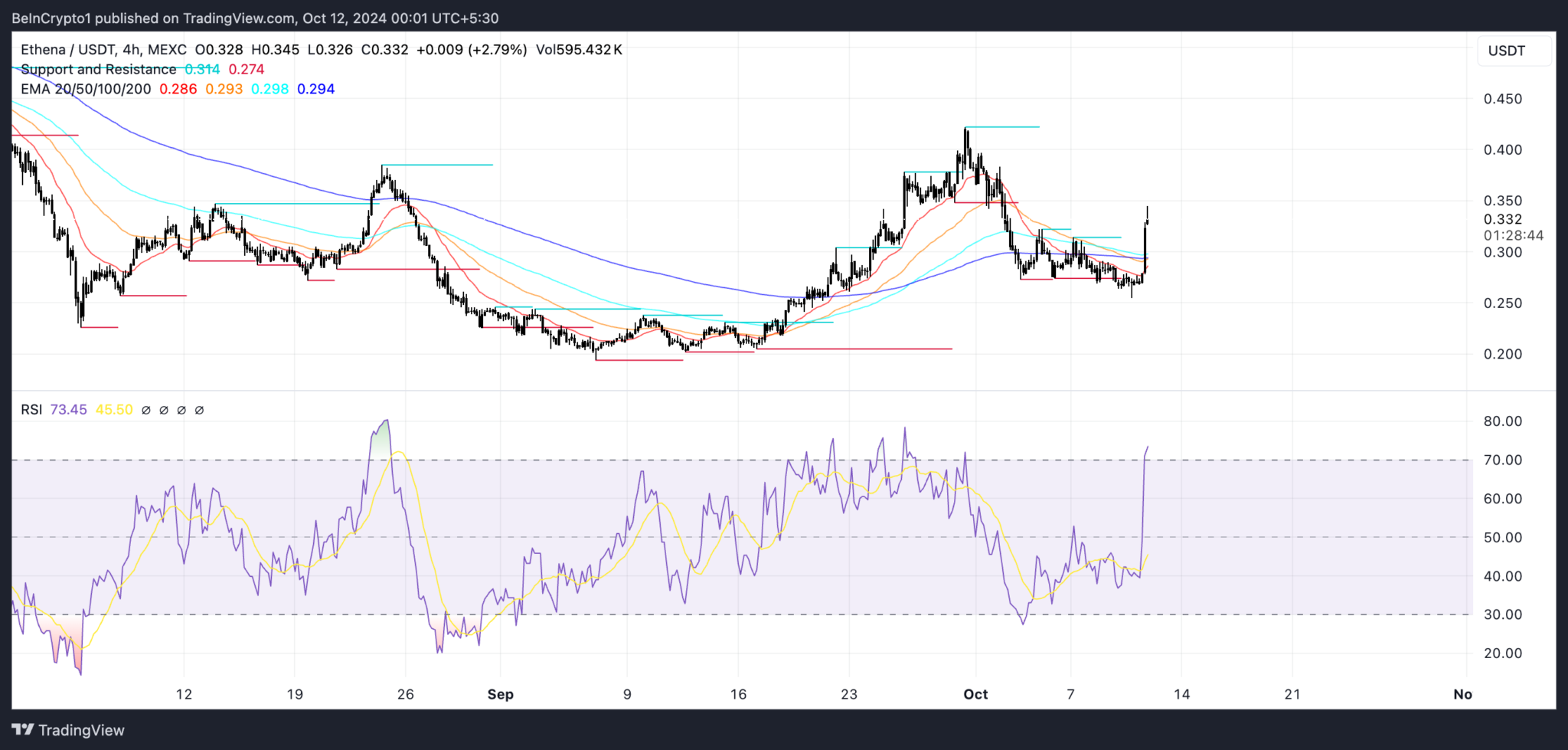 RSI của ENA đã tăng vọt lên 73,19, tăng từ 39 trong chưa đầy một ngày. Đó là tín hiệu của áp lực mua mạnh nhưng cũng là dấu hiệu cho thấy tài sản hiện đã bị mua quá mức. Nếu đợt tăng giá tiếp tục, ENA có thể đạt 0,42 USD, tức là tăng 27%.