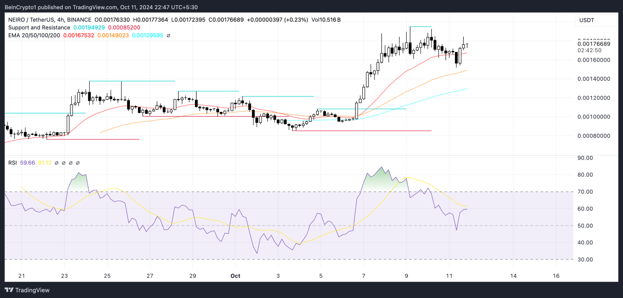 Với các đường EMA cho thấy sức mạnh, có sự tự tin ngày càng tăng rằng NEIRO có thể tiếp tục tăng lên, có khả năng lập kỷ lục mới. RSI cũng có vẻ khá lành mạnh ở mức 59,55, cho thấy đồng tiền này đang tăng đà mà không bị mua quá mức.