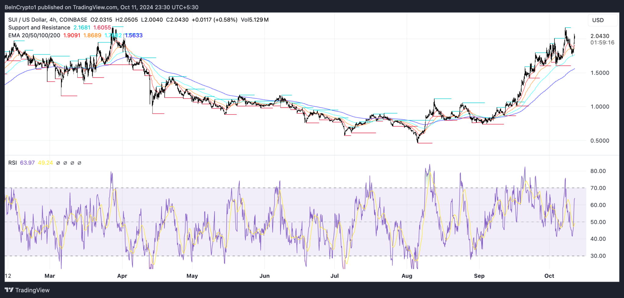 SUI đã nổi lên như một trong những đồng tiền tăng giá mạnh nhất trong bảy ngày qua, với mức giá tăng gần 16% trong giai đoạn này. Sự gia tăng đáng chú ý này đã thu hút sự chú ý của các nhà giao dịch đang tận dụng đà tăng giá gần đây của đồng tiền này. Các đường EMA của SUI vẫn dương, cho thấy xu hướng chung vẫn là tăng.