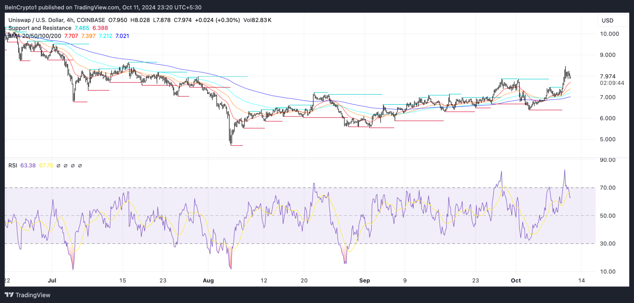 Đường EMA của UNI vẫn tăng giá, cho thấy xu hướng chung vẫn tích cực. Nếu UNI duy trì xu hướng tăng, nó có thể thực hiện một nỗ lực khác để phá vỡ ngưỡng kháng cự ở mức 8,2 USD và nếu thành công, mục tiêu tiếp theo sẽ là 8,6 USD. Tuy nhiên, Chỉ số sức mạnh tương đối (RSI) của UNI đã giảm xuống còn 63, giảm từ mức cao 81 chỉ một ngày trước.