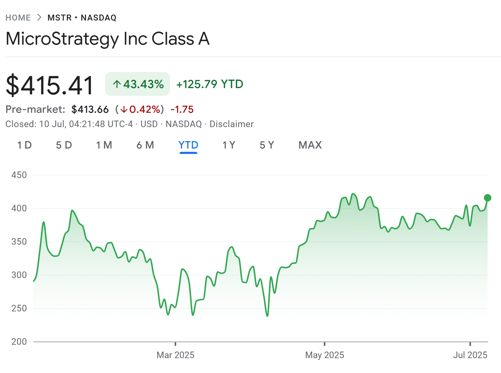 Cổ phiếu Strategy tăng 43% so với đầu năm. Nguồn: Google Finance.