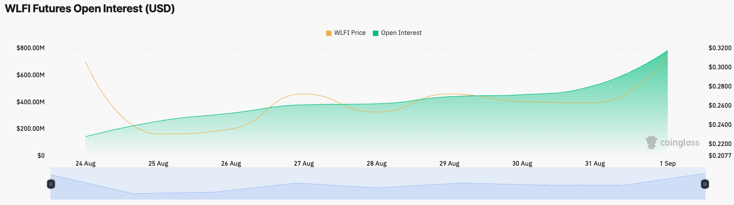 Lượng hợp đồng mở (open interest) đối với các hợp đồng phái sinh của token World Liberty Financial (WLFI) đã chạm mức 950 triệu USD trong phiên giao dịch sớm ngày thứ Hai, trước khi giảm nhẹ xuống còn 887 triệu USD — vẫn tăng 45% trong 24 giờ qua, theo dữ liệu từ CoinGlass.