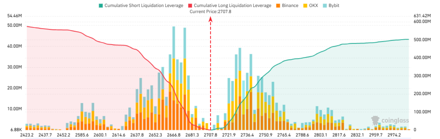 Một đợt điều chỉnh tiềm năng xuống dưới 2,600 USD có thể kích hoạt hơn 500 triệu USD thanh lý vị thế short có đòn bẩy trên tất cả các sàn giao dịch, theo dữ liệu từ CoinGlass.