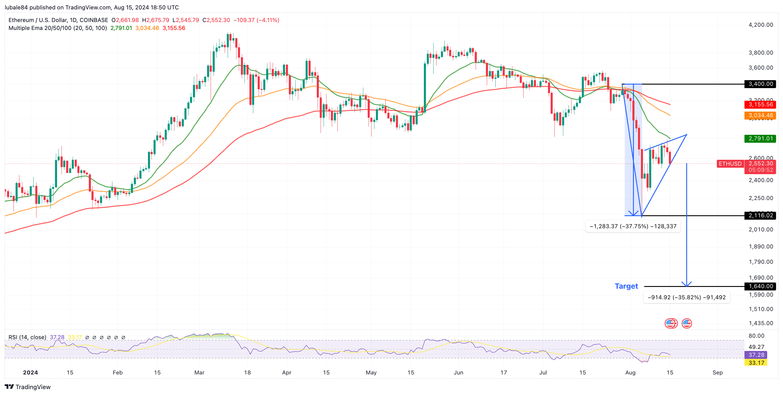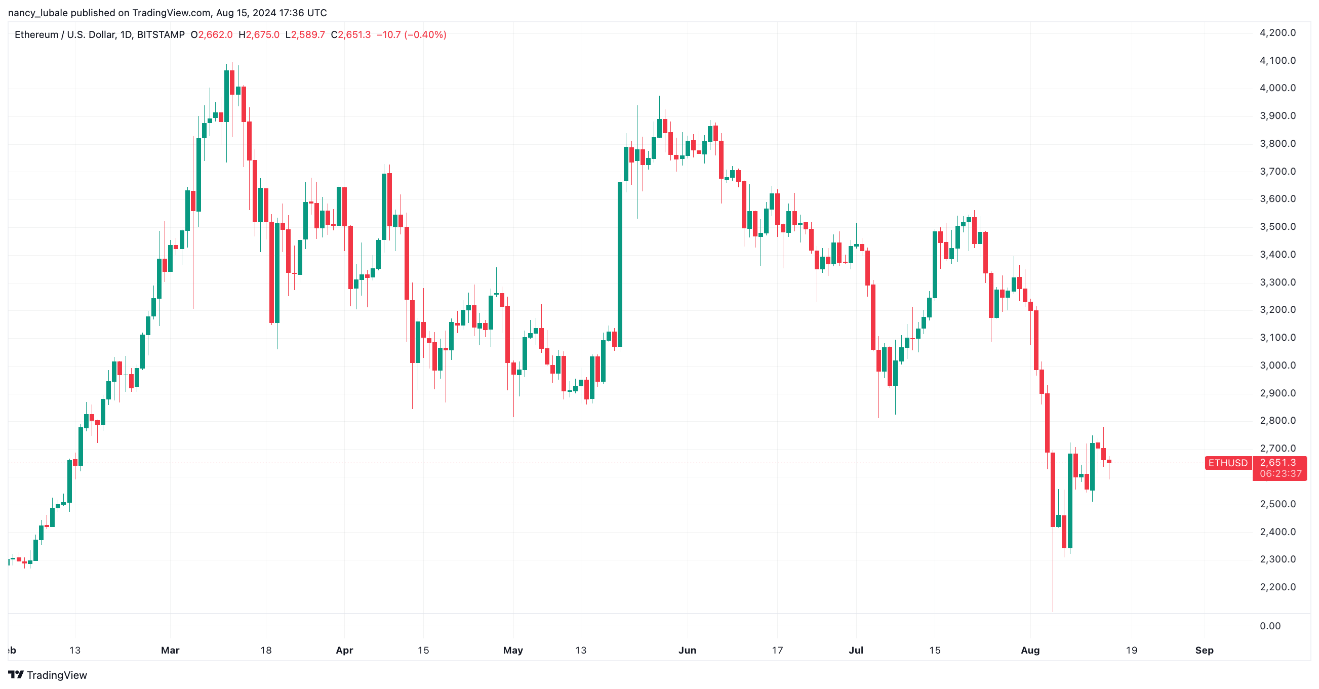 Dữ liệu từ TradingView cho thấy giá ETH đã giảm từ mức cao nhất là 3.400 USD vào ngày 29 tháng 7, giảm 35,5% xuống mức thấp nhất là 2.116 USD vào ngày 5 tháng 8. Giá kể từ đó đã phục hồi lên mức 2.552 USD.