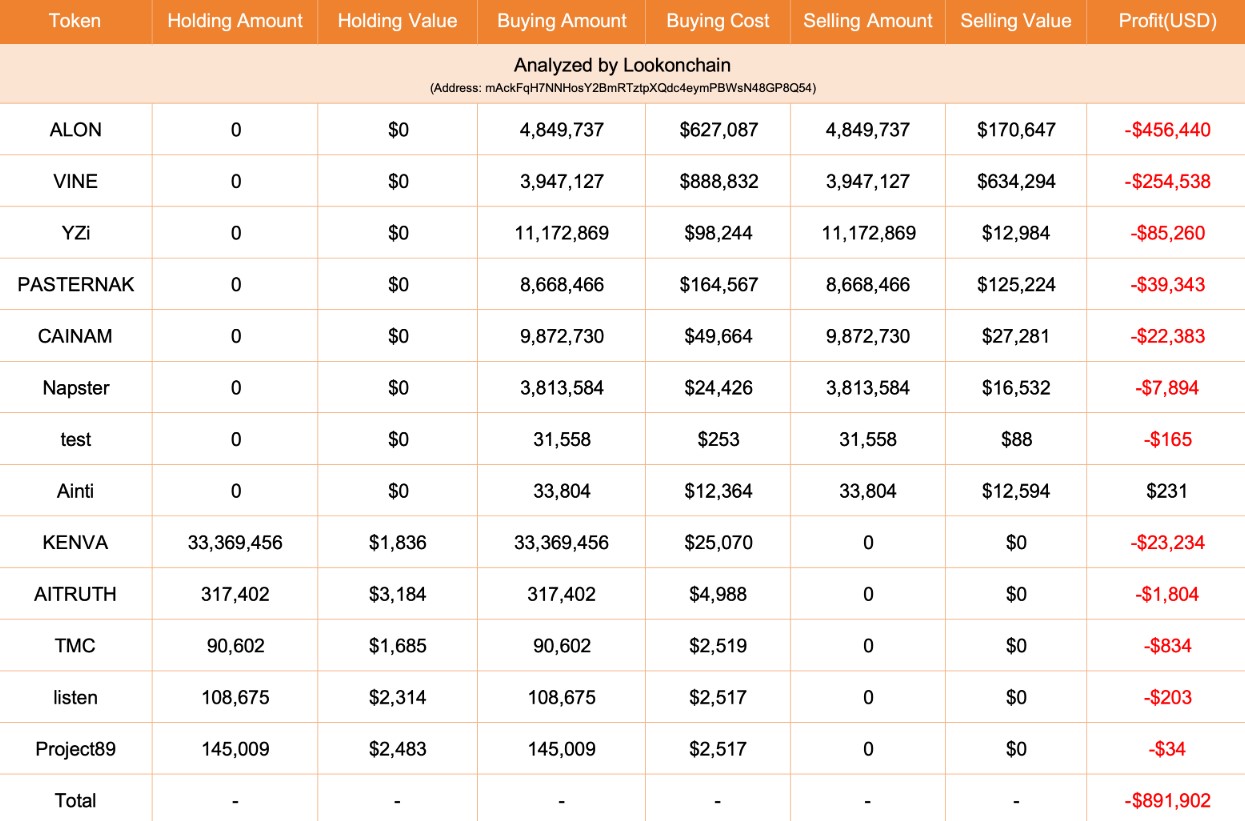 Nhà giao dịch mất gần 900.000 USD vào memecoin. Nguồn: Lookonchain.