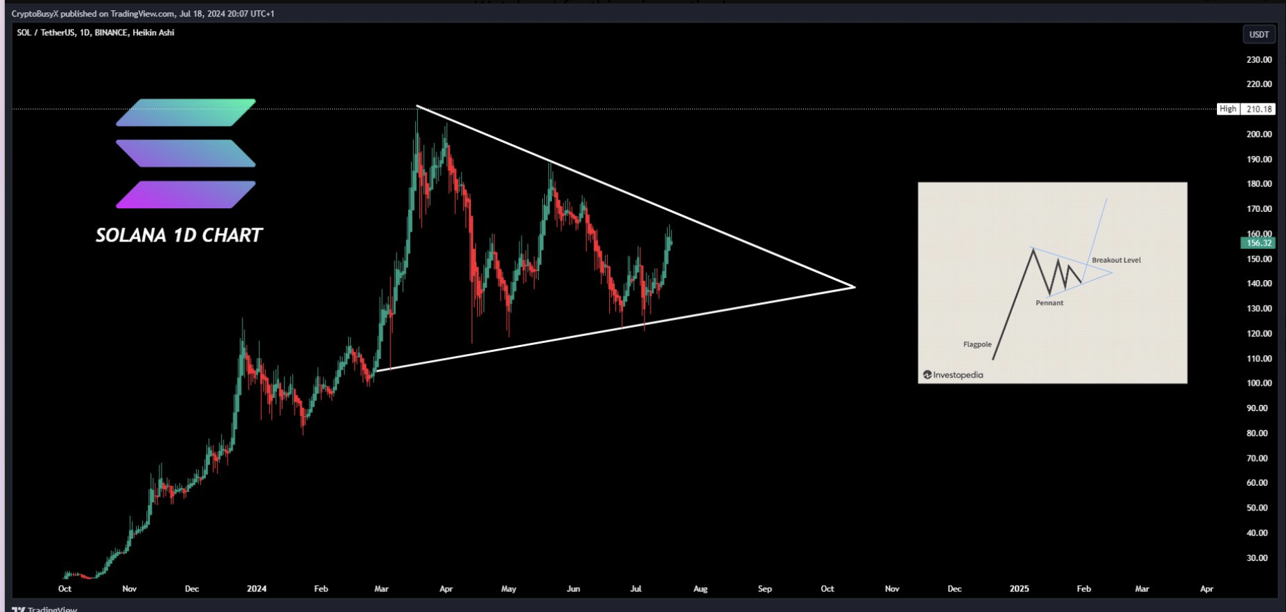“SOL HUGE PENNANT trên biểu đồ 1 ngày”, tài khoản giao dịch CryptoBusy đã viết trong bài đăng ngày 18 tháng 7, đây là một mô hình phát triển khi giá hợp nhất bên trong mô hình hình tam giác sau một động thái giảm mạnh.