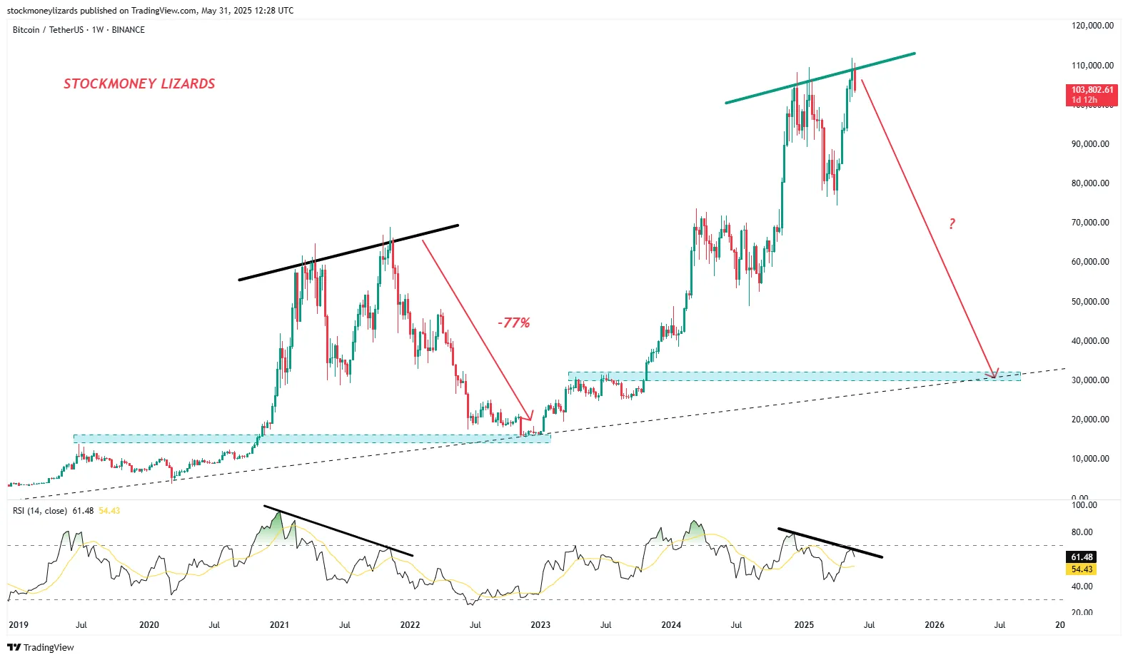 Một số tín hiệu phân kỳ đã xuất hiện. Những tín hiệu này cho thấy Bitcoin có thể đảo chiều vào tháng 06. Nếu điều này xảy ra, nó sẽ hoàn thành mô hình double-top và có thể dẫn đến một đợt điều chỉnh hơn 70%, giống như năm 2021.