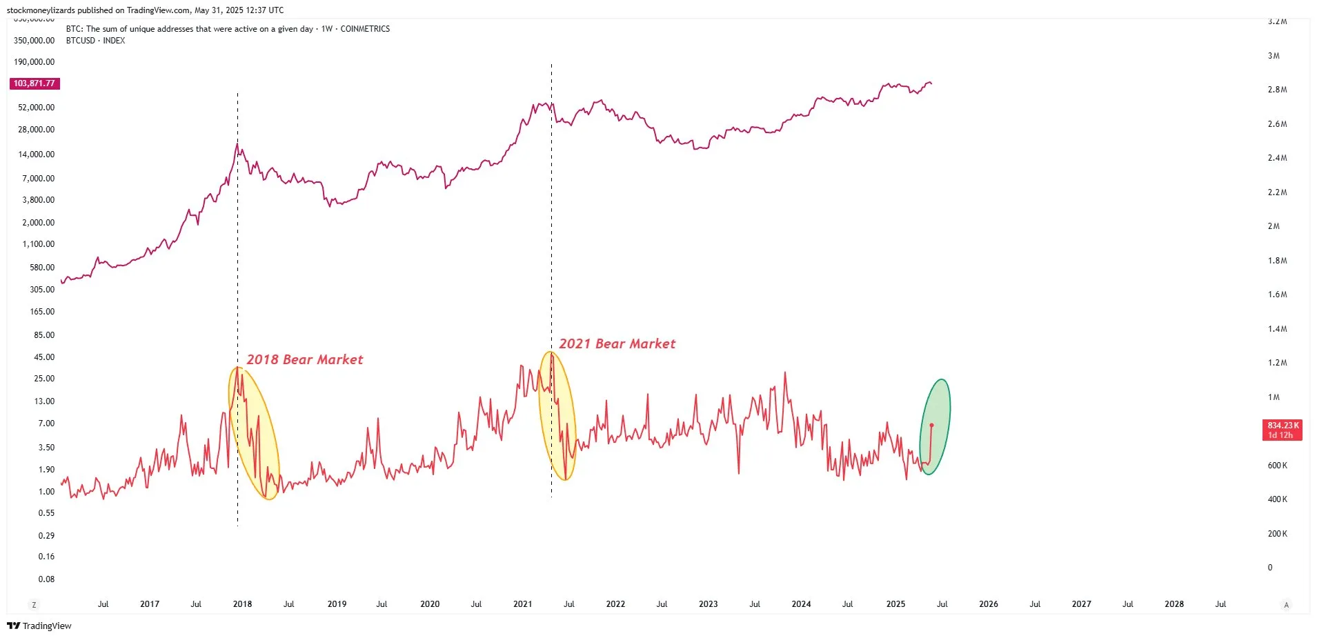 Bên cạnh việc đặt câu hỏi về độ tin cậy của các chỉ báo kỹ thuật, ông cũng nhấn mạnh một số tín hiệu tích cực bị bỏ qua. Ví dụ, số lượng địa chỉ ví hoạt động đã tăng mạnh, cho thấy sự tham gia ngày càng tăng từ cả nhà đầu tư nhỏ lẻ và tổ chức.