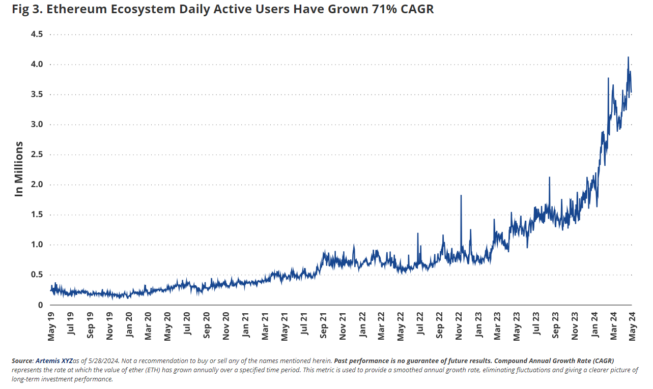 Tăng trưởng số lượng người dùng hoạt động hàng ngày của Ethereum. Nguồn: VanEck.