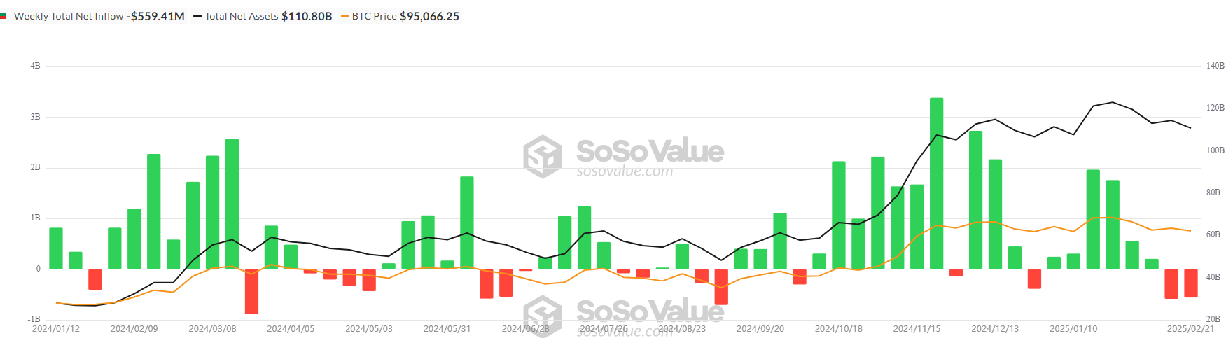 Các quỹ Bitcoin ETF spot tại Mỹ đã chứng kiến hơn 1,14 tỷ USD rút vốn ròng trong hai tuần tính đến ngày 21 tháng 2, theo dữ liệu từ Sosovalue.