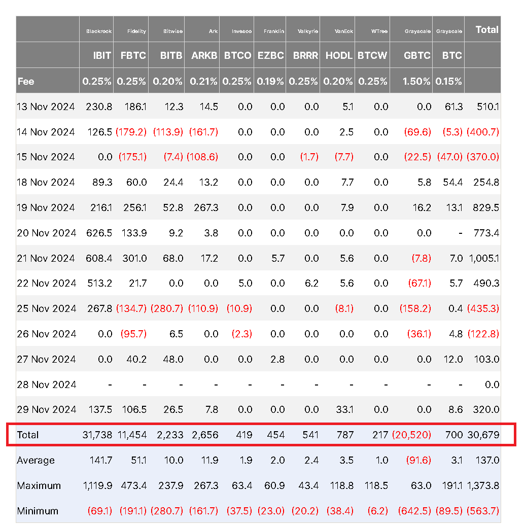 Một đợt tăng giá kéo dài một tháng vào tháng 11 đã dẫn đến giá Bitcoin tăng vọt từ 68.000 USD lên 99.000 USD. Trong bối cảnh tâm lý lạc quan, các quỹ Bitcoin ETF spot đã thu về tổng cộng 6,87 tỷ USD.