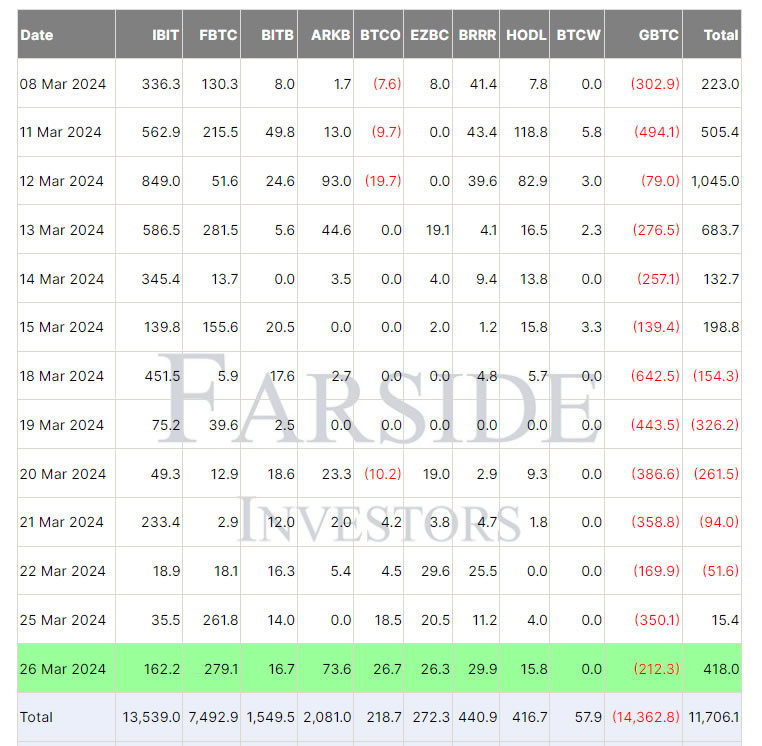 Được dẫn dắt bởi dòng vốn mạnh mẽ vào quỹ của Blackrock và Fidelity, 10 quỹ ETF Bitcoin spot đã chứng kiến dòng vốn ròng tổng hợp là 418 triệu USD vào ngày 26 tháng 3, theo dữ liệu của Farside Investor.