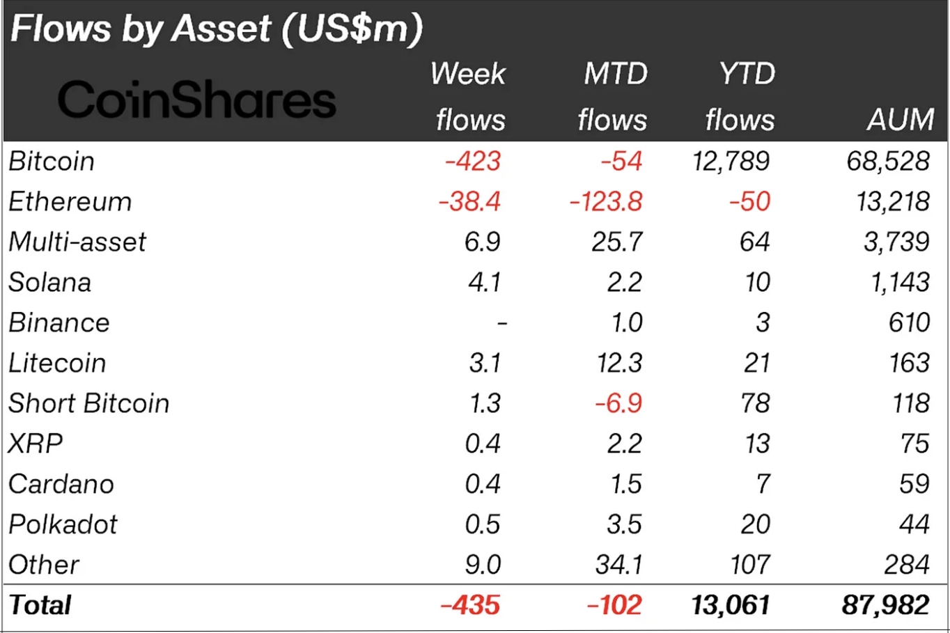 The outflows were focussed solely on Bitcoin and Ethereum which saw US$423m and US$38m respectively, while a broad range of altcoins saw inflows.