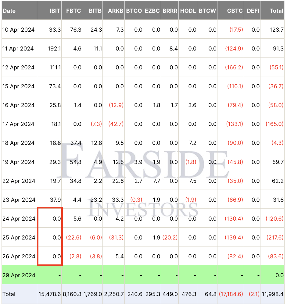 Dữ liệu từ các nhà đầu tư Farside tiết lộ rằng Bitcoin ETF của BlackRock, IBIT, đã ghi nhận “dòng chảy bằng 0” lần đầu tiên vào tuần trước. Các tổ chức phát hành khác đã trải qua nhiều ngày không có dòng tiền vào trong vài tuần qua trong bối cảnh dòng tiền rút ra từ GBTC của Grayscale giảm tốc.