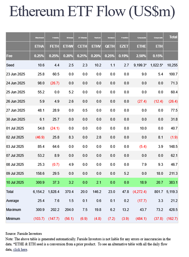 Phần lớn dòng tiền chảy vào đến từ quỹ ETF iShares Ethereum Trust (ETHA) của BlackRock, với 300,9 triệu USD tiền chảy vào ròng – mức dòng tiền chảy vào hàng ngày cao nhất từng được ghi nhận.