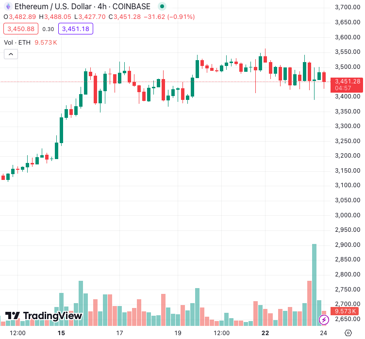 ETH đang được giao dịch ở mức 3.451 USD tại thời điểm viết bài, giảm 1,4% trong 24 giờ qua và 1,5% trong tuần, theo dữ liệu của TradingView.