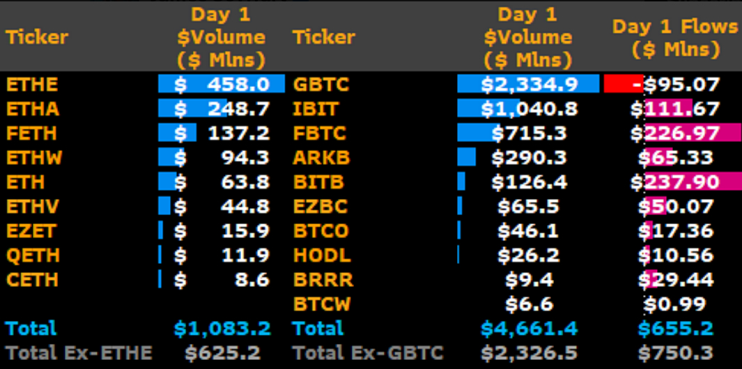 Nhìn chung, các quỹ Ether ETF spot đã tạo ra 1,08 tỷ USD khối lượng giao dịch tích lũy trong ngày đầu tiên giao dịch — bằng 23% khối lượng mà các quỹ Bitcoin ETF spot đạt được khi mới ra mắt.