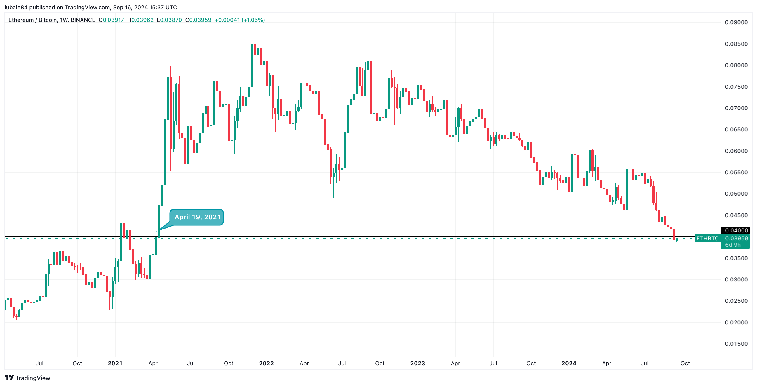 Điều này khiến tỷ lệ ETH/BTC giảm xuống dưới 0,04 USD, mức thấp nhất kể từ tháng 4 năm 2021.