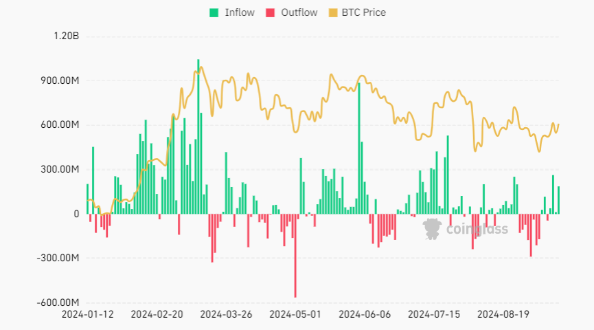 Theo dữ liệu của CoinGlass,  các quỹ Bitcoin ETF spot được ra mắt vào ngày 10 tháng 1 năm 2024 và đã tích lũy được dòng tiền ròng là 17,5 tỷ USD sau tám tháng.