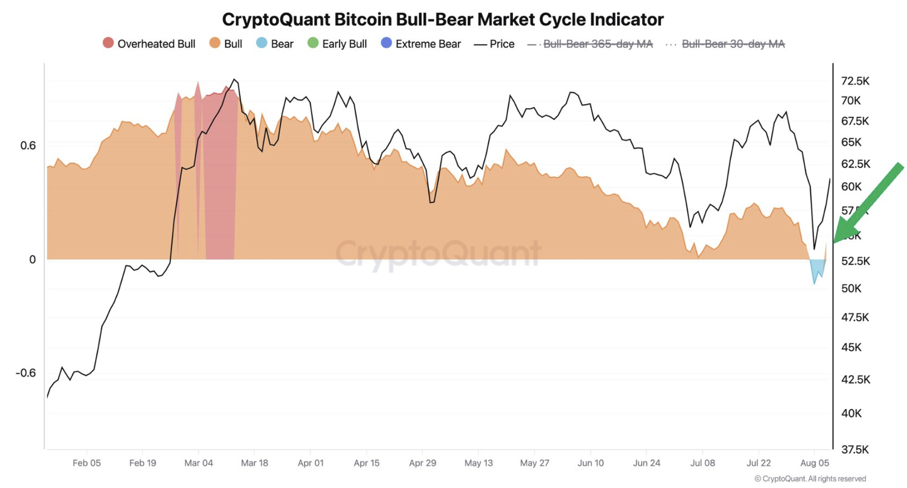 Chỉ báo Bitcoin Bull-Bear Market Cycle, theo dõi các giai đoạn tâm lý nhà đầu tư, đã chuyển sang báo hiệu tình hình tăng giá, sau ba ngày liên tục nhấp nháy màu đỏ khi giá Bitcoin giảm xuống mức thấp chưa từng thấy kể từ tháng 2.