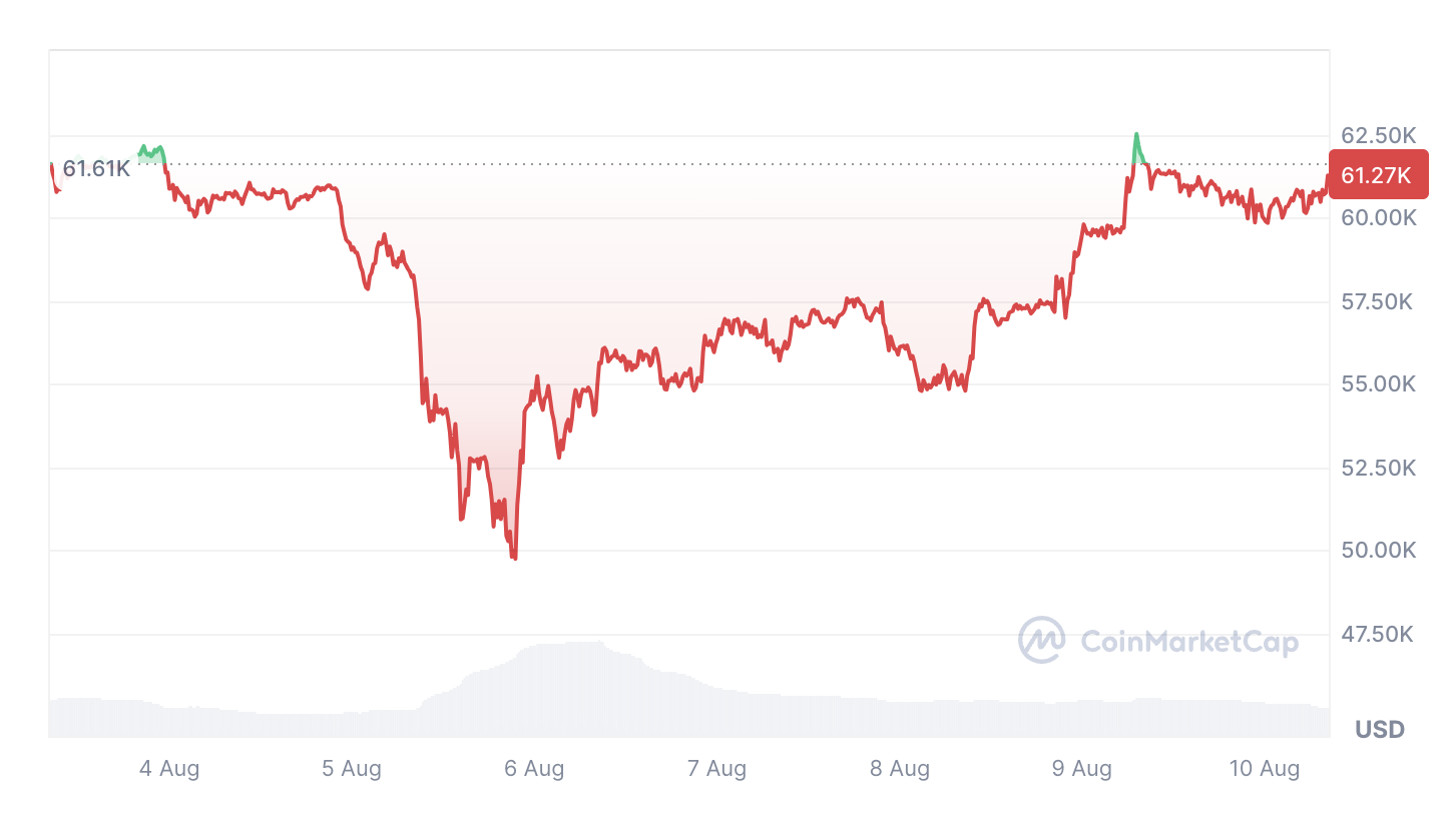 Theo dữ liệu của CoinMarketCap, Bitcoin sau đó được giao dịch dưới mức quan trọng là 60.000 USD cho đến ngày 8 tháng 8.