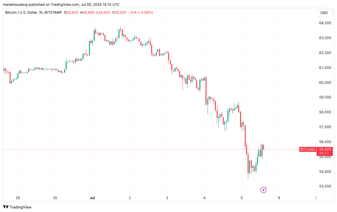Dữ liệu từ TradingView đã theo dõi mức giá Bitcoin (BTC) tăng 3,8% từ mức thấp 55.550 USD trên Bitstamp.