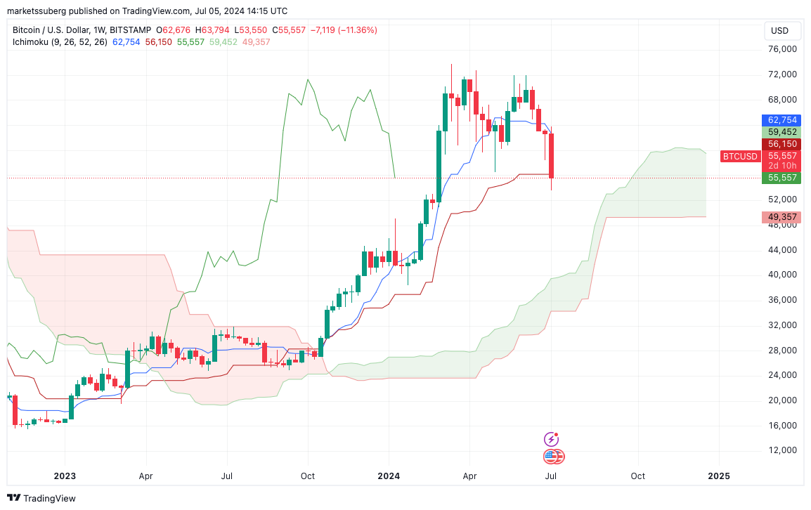 Ở mức 56.150 USD, giá đã giảm xuống dưới đường xu hướng Kijun Sen trên khung thời gian hàng tuần, với nến hàng tuần nằm giữa đường này và đường xu hướng trên, Tenkan Sen.