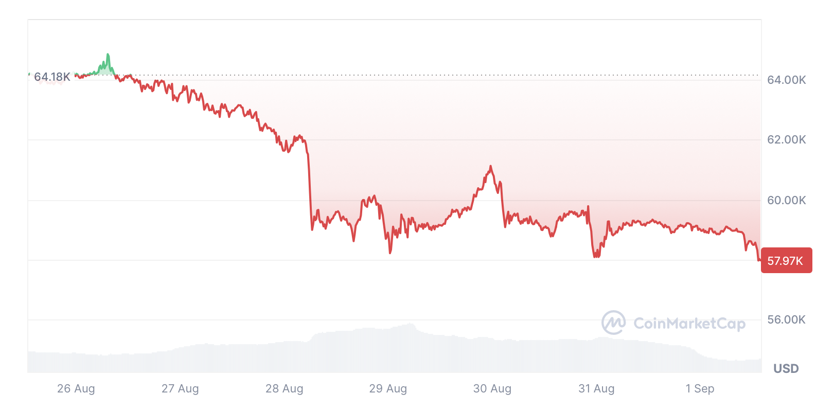 Theo dữ liệu của CoinMarketCap, Bitcoin được giao dịch ở mức 57.426 USD tại thời điểm viết bài, giảm 10,49% trong bảy ngày qua.