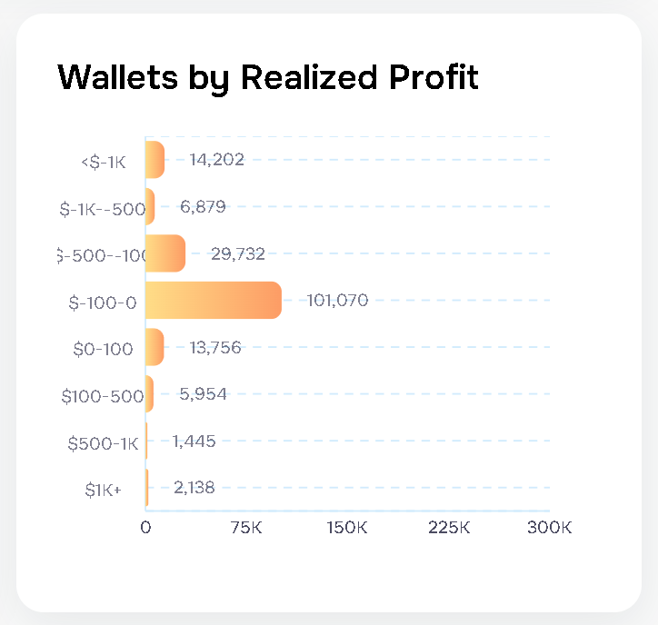 Trong số các ví báo cáo có lợi nhuận, chỉ có 2.138 người dùng kiếm được hơn 1.000 USD, phần lớn lợi nhuận dưới 100 USD. Như thể hiện trong biểu đồ trên, khoảng 7.400 ví Polymarket kiếm được lợi nhuận trong khoảng 100–1.000 USD.