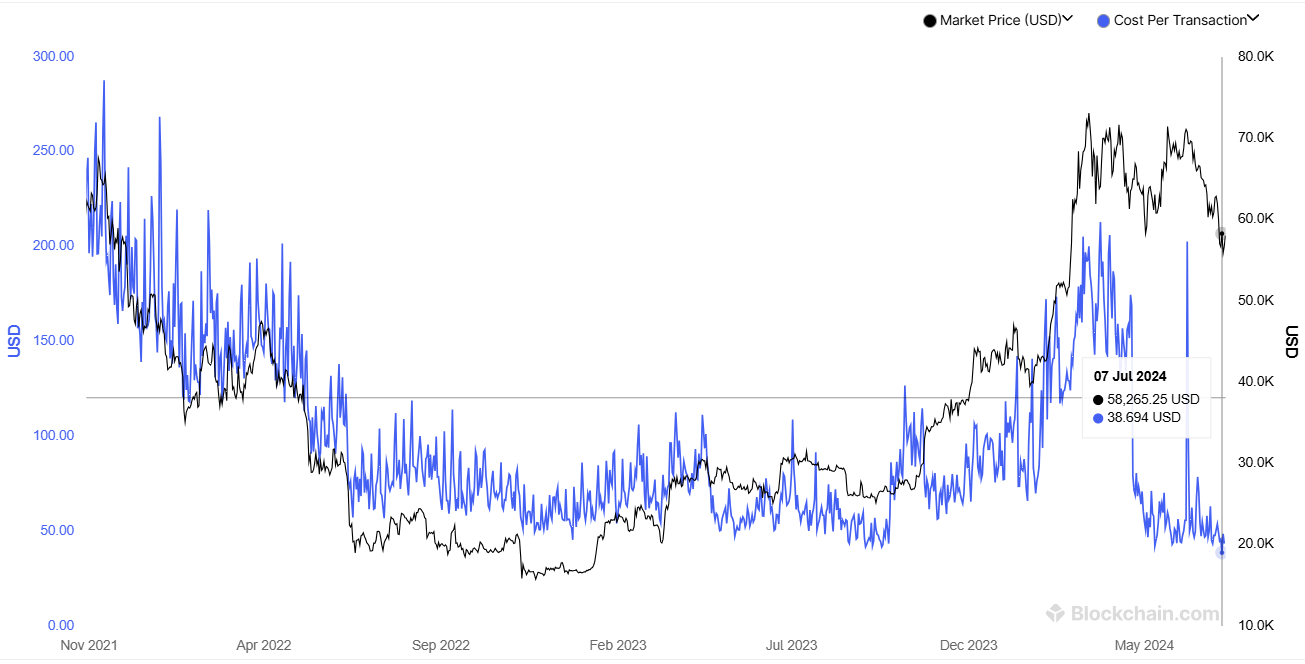 Phí trung bình liên quan đến mỗi giao dịch Bitcoin đã giảm xuống mức thấp nhất trong bốn năm vào ngày 7 tháng 7 ở mức 38,69 USD, mức được thấy lần cuối vào năm 2020.