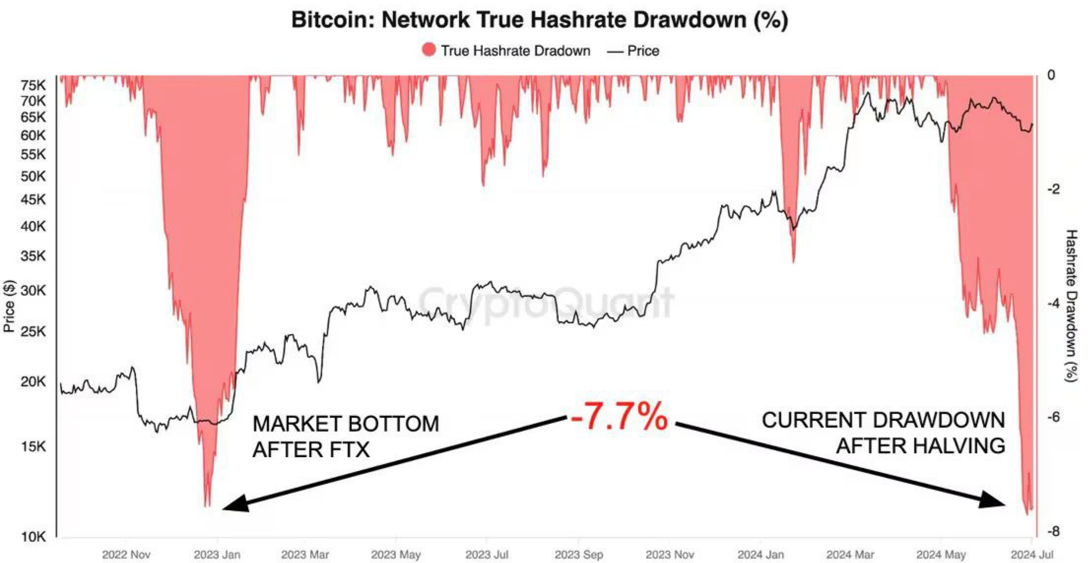 Đầu hàng của thợ đào Bitcoin phản ánh mức tháng 12 năm 2022 (thời điểm FTX sụp đổ) với mức hashrate giảm 7,7%. Sự sụt giảm như vậy thường báo hiệu đáy tiềm năng của thị trường.