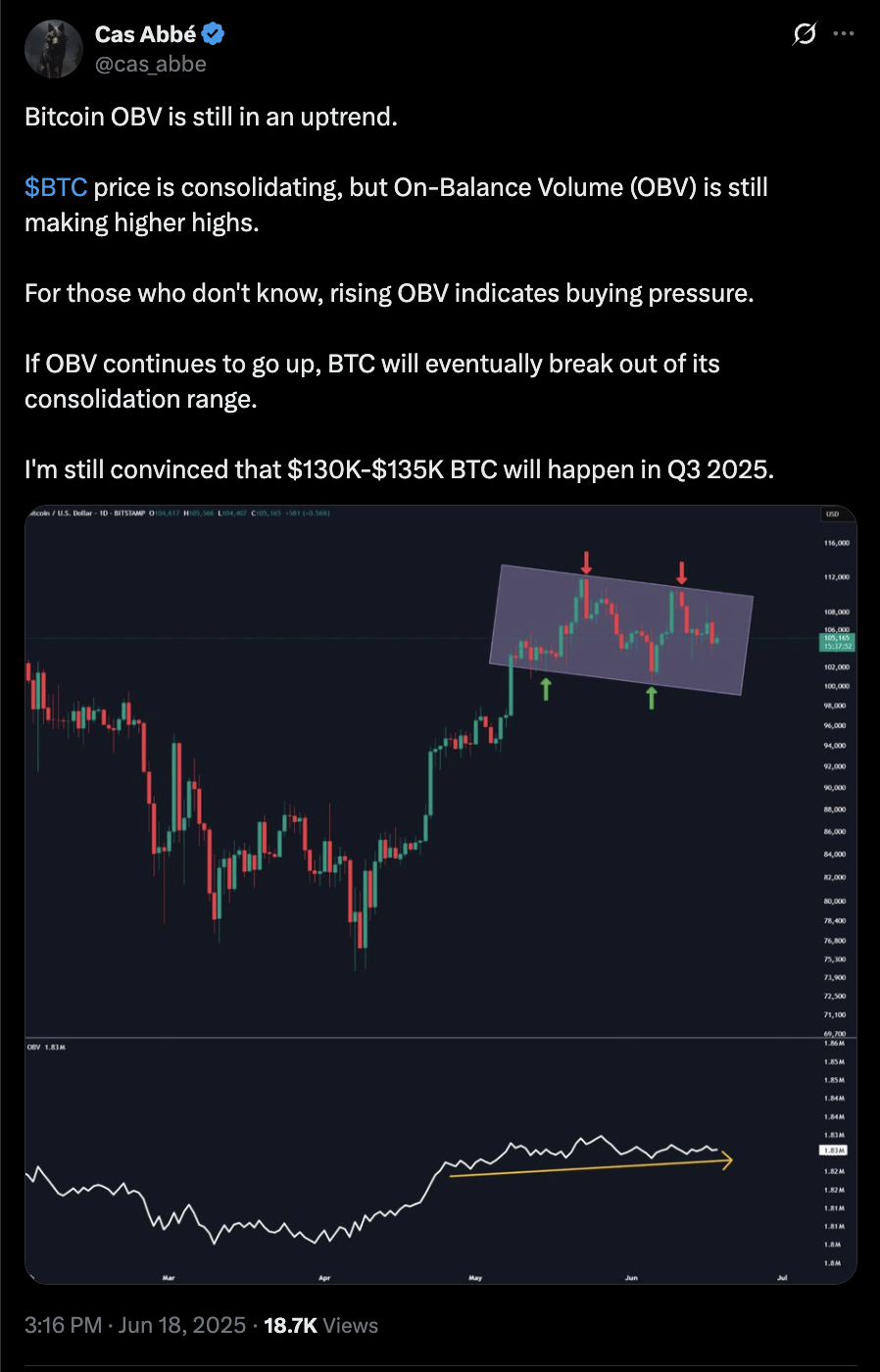 Sự phân kỳ giữa giá và chỉ báo OBV đang báo hiệu “áp lực mua” ngày càng tăng, theo nhà phân tích thị trường Cas Abbé. Ông dự đoán rằng OBV tiếp tục tăng sẽ hỗ trợ đẩy giá BTC lên vùng 130,000 USD – 135,000 USD vào quý 3 năm 2025.