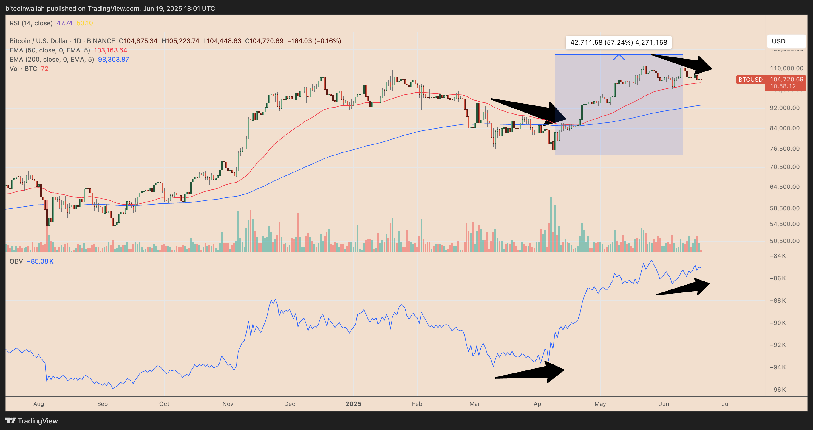 Từ tháng 3 đến tháng 4, BTC giao dịch ngang trong khoảng từ 76.000 đến 84.000 USD, khi OBV bắt đầu hình thành các mức thấp cao hơn. Sự phân kỳ được theo sau bởi một đợt tăng giá 57%, với BTC đạt hơn 110.000 USD vào tháng 5.