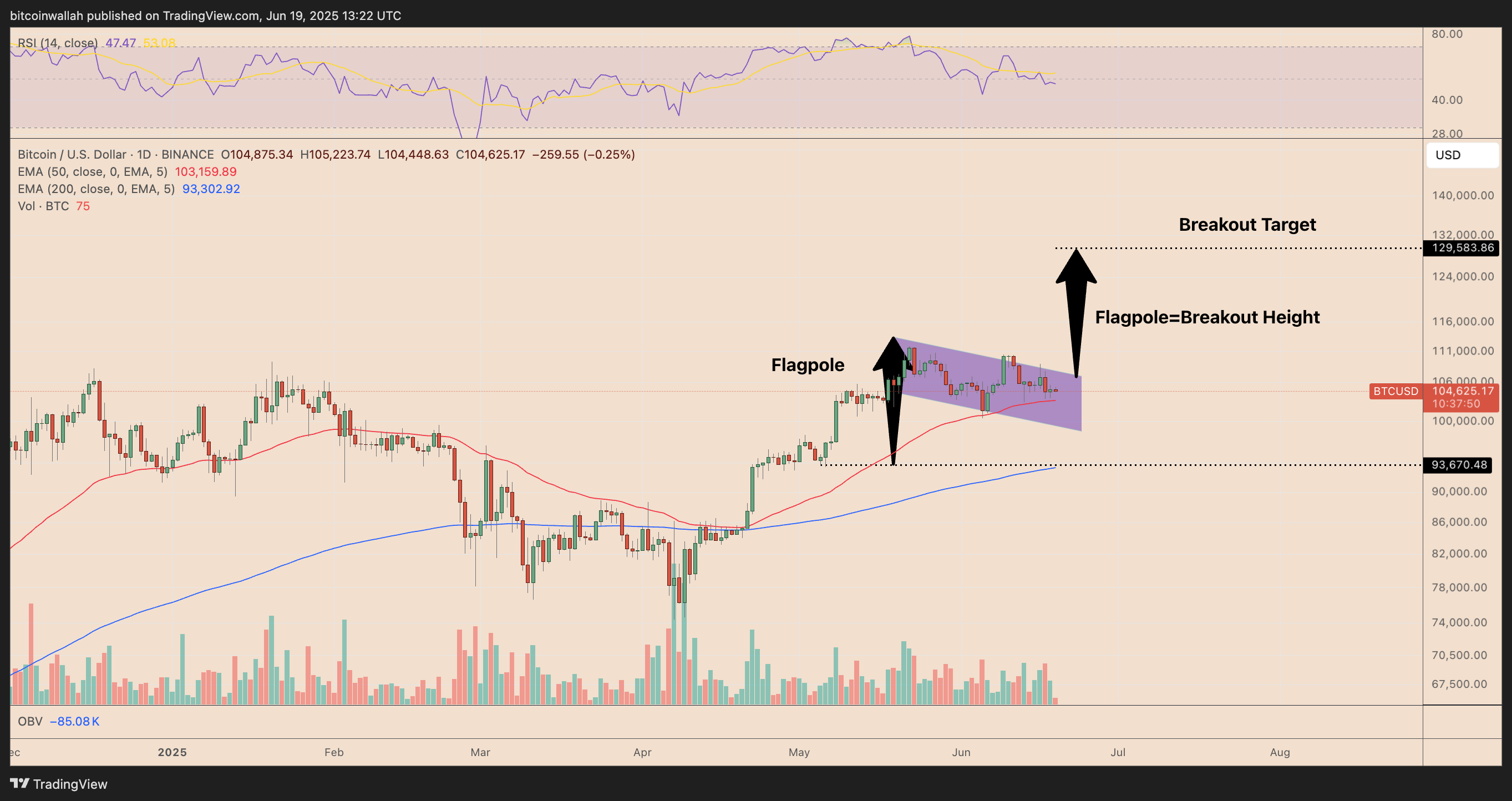 Trên biểu đồ hàng ngày, mức tăng vọt của BTC lên gần 112.000 USD vào tháng 5 từ mức khoảng 93.670 USD đã thiết lập nên “cột cờ”. Kể từ đó, giá đã củng cố theo hướng đi xuống bên trong một kênh song song, hình thành nên “cờ”.