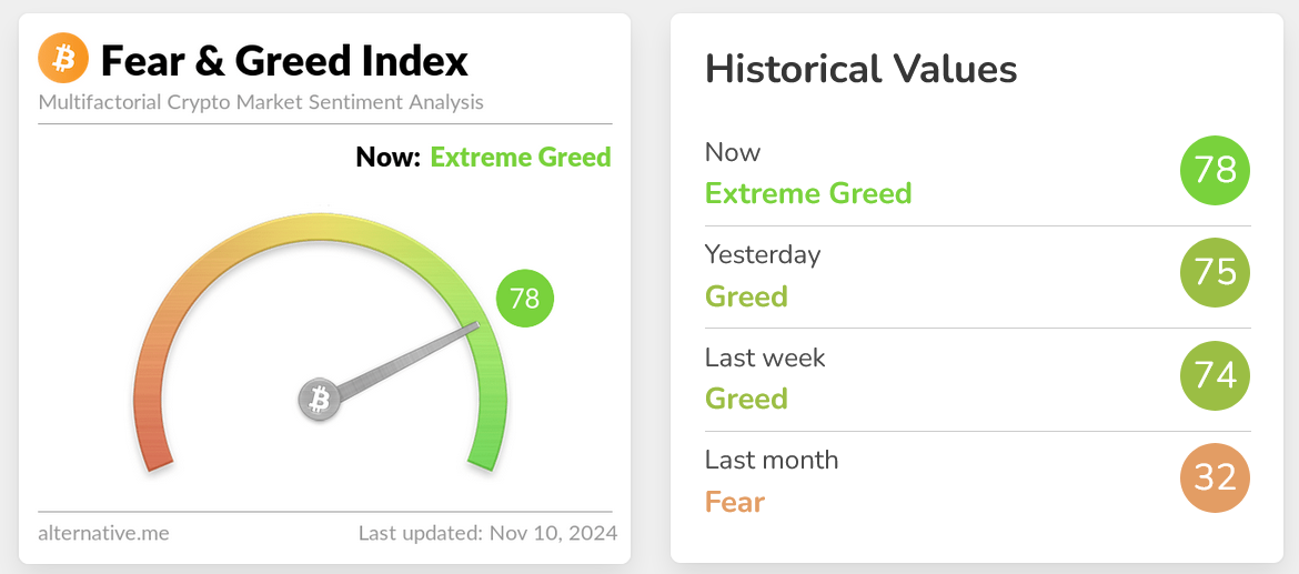 Bitcoin đã chạm đến vùng “Tham lam cực độ” (75-100) vào ngày 31 tháng 10 và dao động giữa mức 70 và 78 trong tuần qua khi ứng cử viên đảng Cộng hòa Donald Trump giành chiến thắng trong cuộc bầu cử tổng thống Hoa Kỳ.