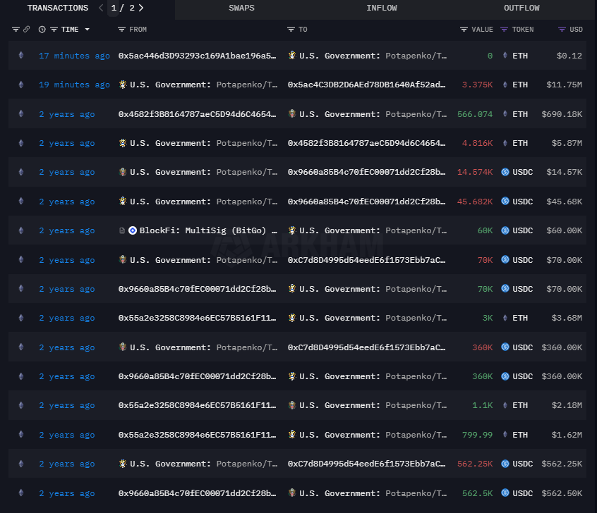 Theo dữ liệu từ Arkham, chính phủ Hoa Kỳ đã thực hiện các giao dịch lớn, cụ thể là địa chỉ giữ tiền bị tịch thu từ các doanh nhân tiền điện tử người Estonia là Sergei Potapenko và Ivan Turogin.