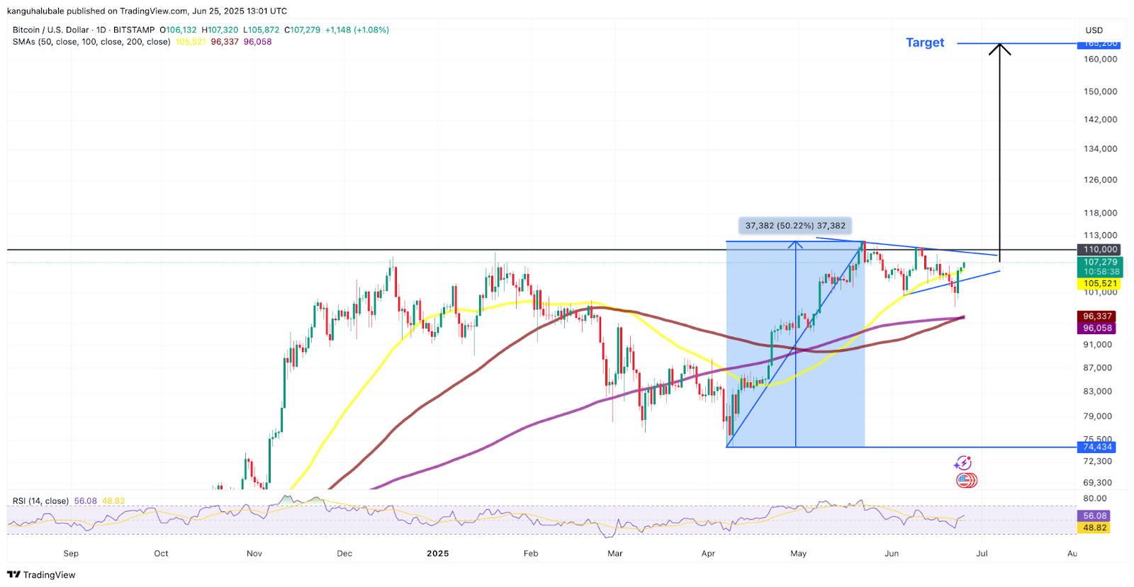 Bitcoin với mô hình “bullish pennant” gợi ý mục tiêu 165,000 USD