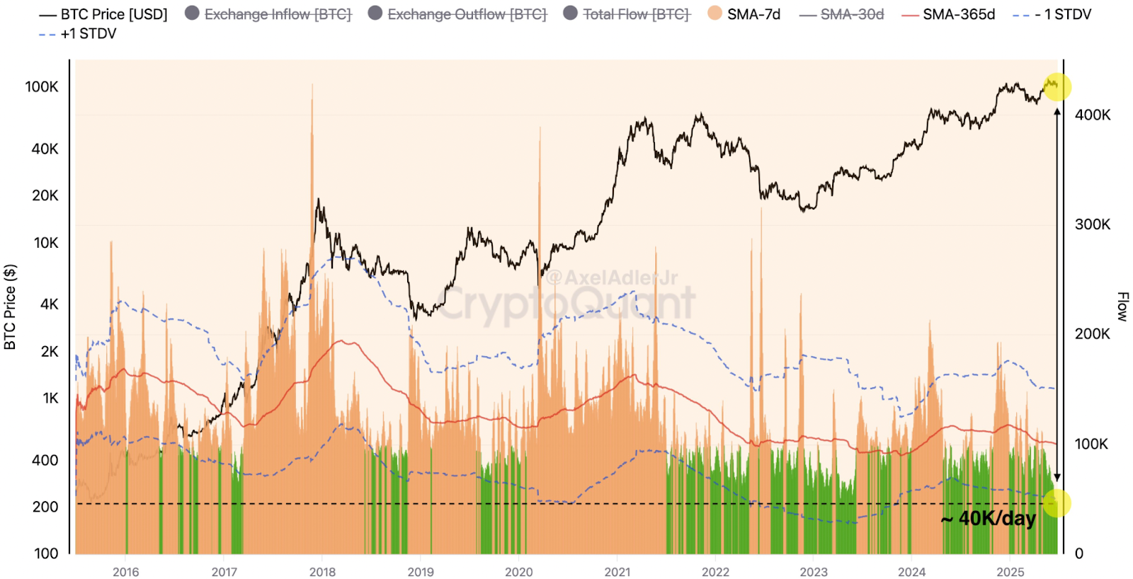 “Khối lượng dòng tiền trung bình (Dòng vào + Dòng ra) trên các sàn giao dịch tập trung đã giảm xuống còn 40.000 BTC mỗi ngày – đây là con số thấp nhất trong 10 năm qua”, nhà nghiên cứu Bitcoin Axel Adler, Jr. lưu ý và nói thêm: