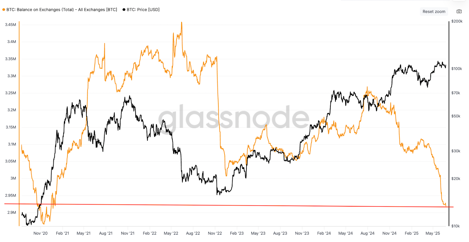 Tổng số dư BTC trên các sàn giao dịch đang ở mức thấp nhất trong bảy năm. Số dư Bitcoin trên các sàn giao dịch là 2,92 triệu BTC tính đến thứ Tư, mức gần nhất được thấy vào tháng 6 năm 2019, theo dữ liệu của Glassnode.