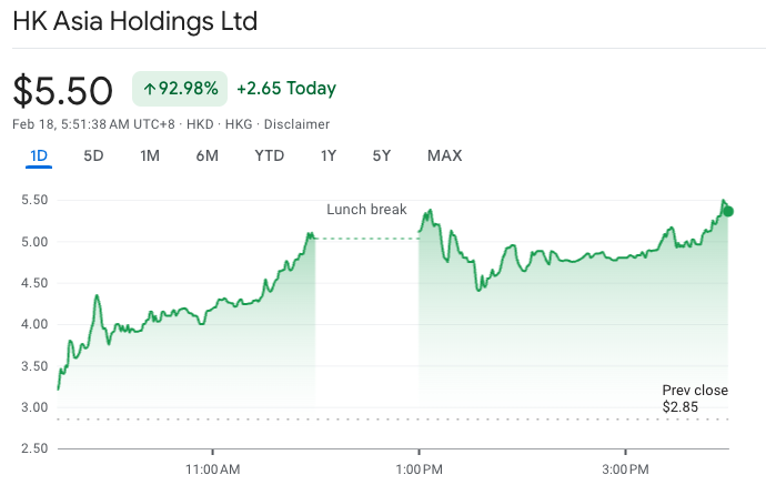 Cổ phiếu của HK Asia Holdings Limited, một công ty đầu tư có trụ sở tại Hồng Kông, đã gần như tăng gấp đôi trong phiên giao dịch ngày 17/2 sau khi công ty tiết lộ rằng họ đã mua một Bitcoin (BTC).