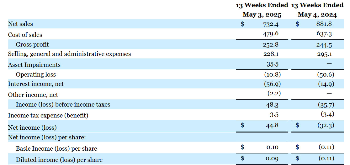GameStop báo lãi ròng 44,8 triệu USD, đảo chiều mạnh so với khoản lỗ ròng 32,3 triệu USD trong quý I năm ngoái. Lỗ hoạt động cũng thu hẹp, chỉ còn 10,8 triệu USD trong kỳ, so với mức lỗ hoạt động 50,6 triệu USD trong quý I năm 2024.