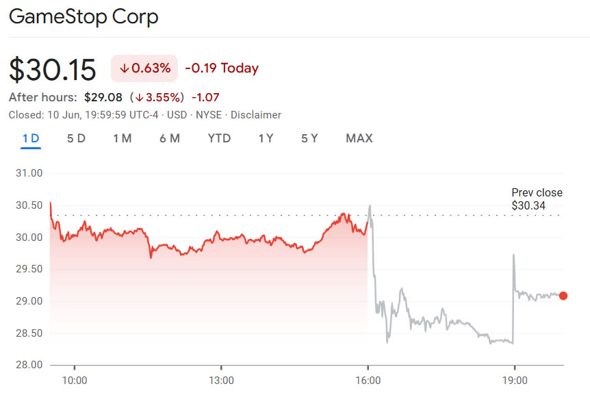 Theo Google Finance, cổ phiếu GameStop đã giảm hơn 3,5% trong phiên giao dịch ngoài giờ vào thứ Ba, xuống mức chỉ hơn 29 USD.