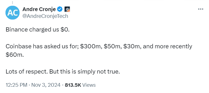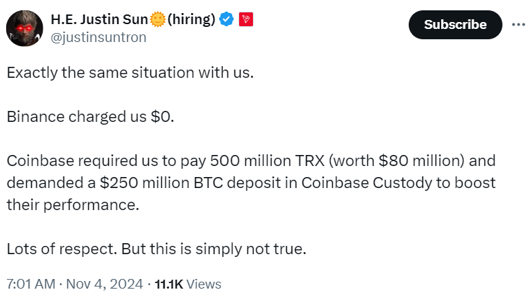 Theo nhà sáng lập Tron Justin Sun, Coinbase đã yêu cầu tổng cộng 330 triệu USD phí để niêm yết Tron. Sun đăng trên X vào ngày 4 tháng 11 rằng trong khi Binance không tính bất kỳ khoản phí nào, Coinbase đã yêu cầu 500 triệu token TRX (trị giá khoảng 80 triệu USD) và khoản tiền gửi Bitcoin trị giá 250 triệu đô la được giữ tại Coinbase Custody.