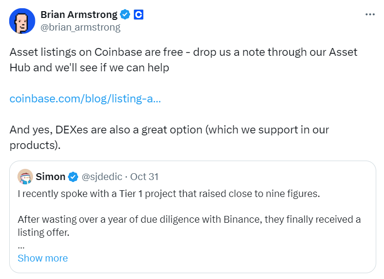 “Niêm yết tài sản trên Coinbase là miễn phí”, Brian Armstrong, đồng sáng lập và giám đốc điều hành của Coinbase đã viết trong bài đăng ngày 2 tháng 11 trên X.