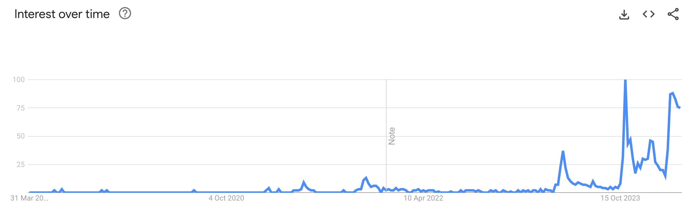 Hiệu suất của memecoin xuất phát từ sự quan tâm ngày càng tăng của nhà đầu tư. Theo dữ liệu từ Google, thuật ngữ “memecoin” đang được tìm kiếm nhiều hơn bao giờ hết trên toàn thế giới.