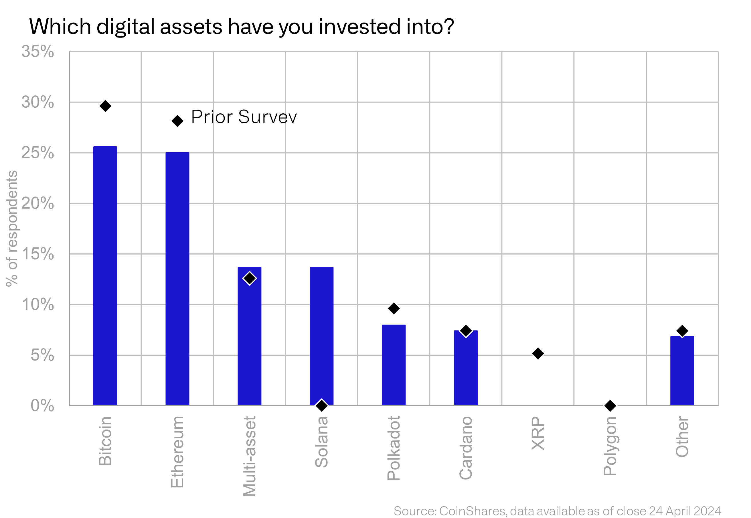 Gần 15% nhà đầu tư được khảo sát cho biết họ đã đầu tư vào SOL, một bước tiến đáng kể so với cuộc khảo sát tháng 1 của CoinShares cho thấy không ai trong số những người được hỏi có bất kỳ khoản đầu tư nào vào altcoin này.